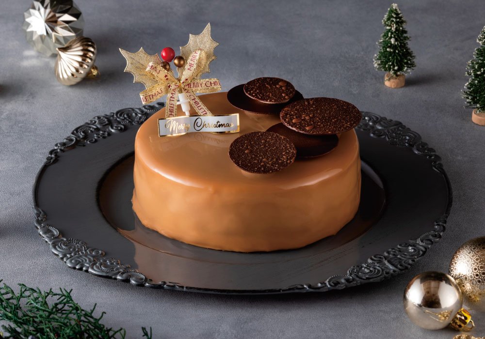 4層のショコラスポンジの間に、ホワイト・ミルク・スイートの各チョコクリームをサンドして7層仕立てに。さらに表面をキャラメルグラサージュでつやつやにコーティングした、贅沢なチョコレートケーキです。