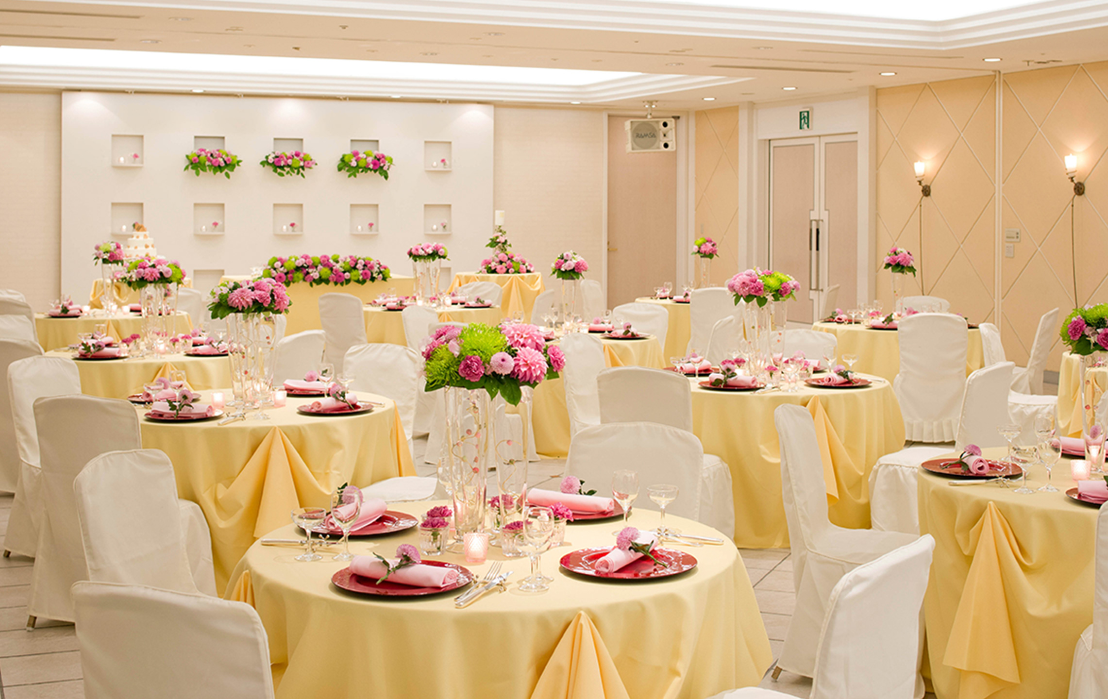 1.どんな色のドレスも映える花嫁の為の特別なパーティールーム。ディスプレイウォールがある。